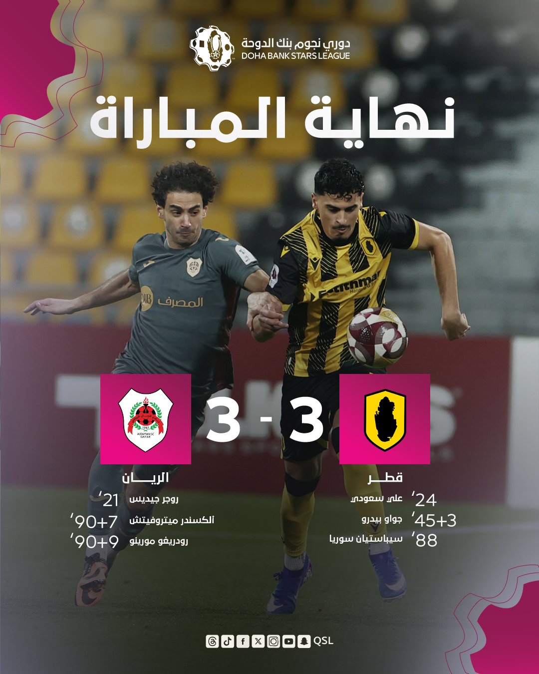 حسم التعادل الإيجابي بنتيجة 3-3 مواجهة نادي قطر والريان في اللقاء الذي جمع الفريقين ضمن منافسات الجولة الخامسة عشرة من دوري نجوم بنك الدوحة للموسم الكروي 2025-2026، على استاد سحيم بن حمد بنادي قطر، في مباراة جاءت حافلة بالإثارة حتى الدقائق الأخيرة.
