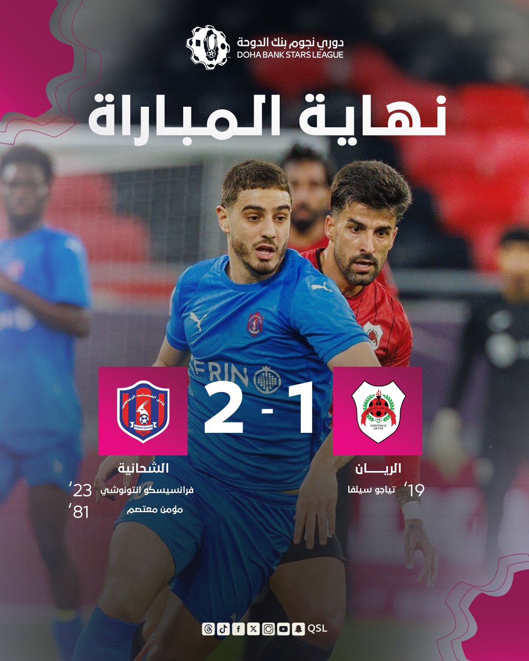 وبهذا الفوز ارتفع رصيد الشحانية إلى 17 نقطة في المركز العاشر، بينما توقف الريان عند 28 نقطة بالمركز الرابع.