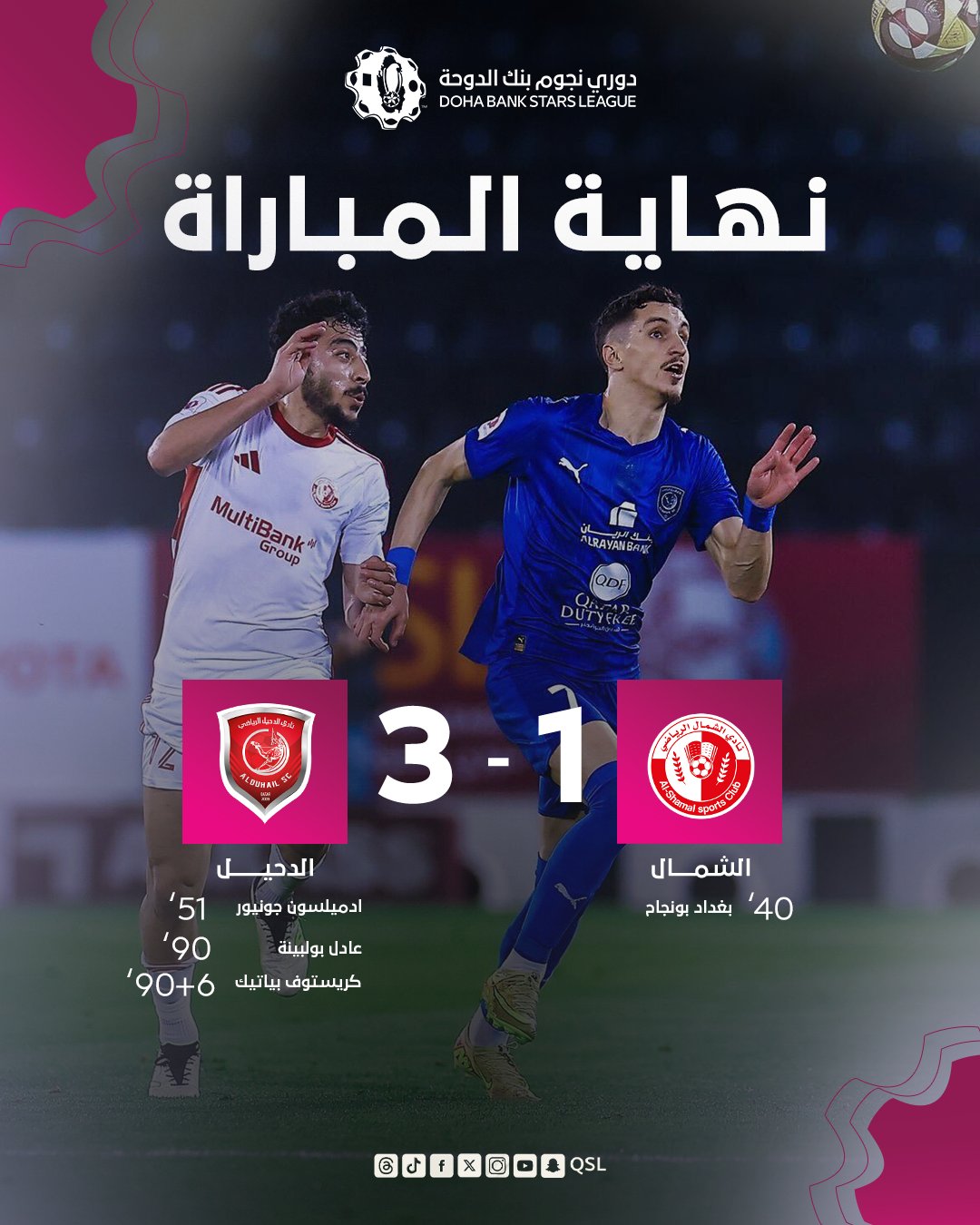 وبهذا الفوز رفع الدحيل رصيده إلى 27 نقطة، بينما توقف رصيد الشمال عند 34 نقطة، في مباراة شهدت إثارة كبيرة وعودة قوية من الدحيل بعد تأخره في النتيجة.