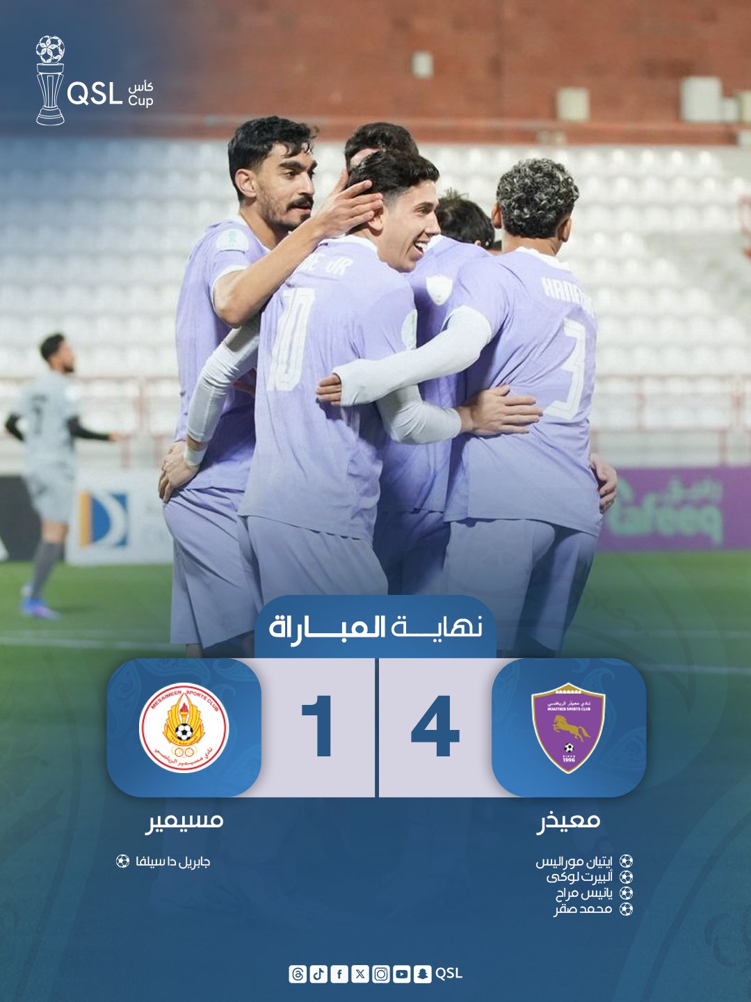 تغلّب معيذر على نظيره مسيمير بنتيجة 4–1، في المباراة التي جمعت الفريقين ضمن منافسات الجولة العاشرة من بطولة QSL، والتي أُقيمت مساء الأربعاء الموافق 21 يناير 2026 على ملعب الشمال.