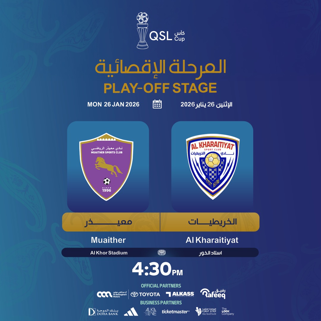 يفتتح فريقا معيذر والخريطيات منافسات المرحلة الإقصائية من بطولة كأس QSL للموسم 2025- 2026، في المباراة التي ستقام بينهما يوم الإثنين 26 يناير 2026، الساعة الرابعة والنصف مساءً، على استاد الخور.