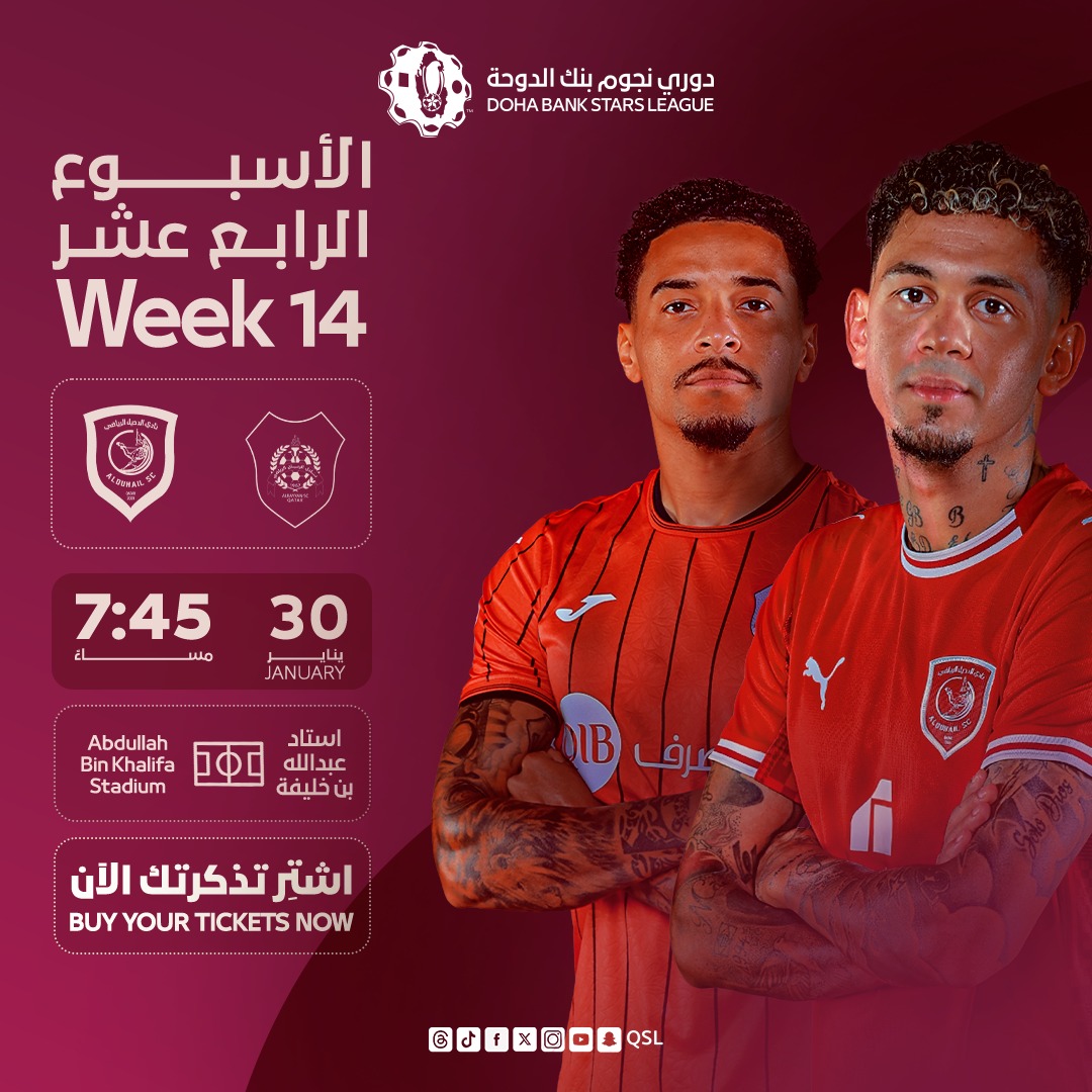 يستضيف الدحيل نظيره الريان، في قمة من العيار الثقيل على استاد عبد الله بن خليفة بنادي الدحيل، في السابعة وخمس وأربعين دقيقة من مساء الجمعة 30 يناير 2026 لحساب مباريات الأسبوع الرابع عشر من منافسات دوري نجوم بنك الدوحة للموسم الكروي 2025-2026.