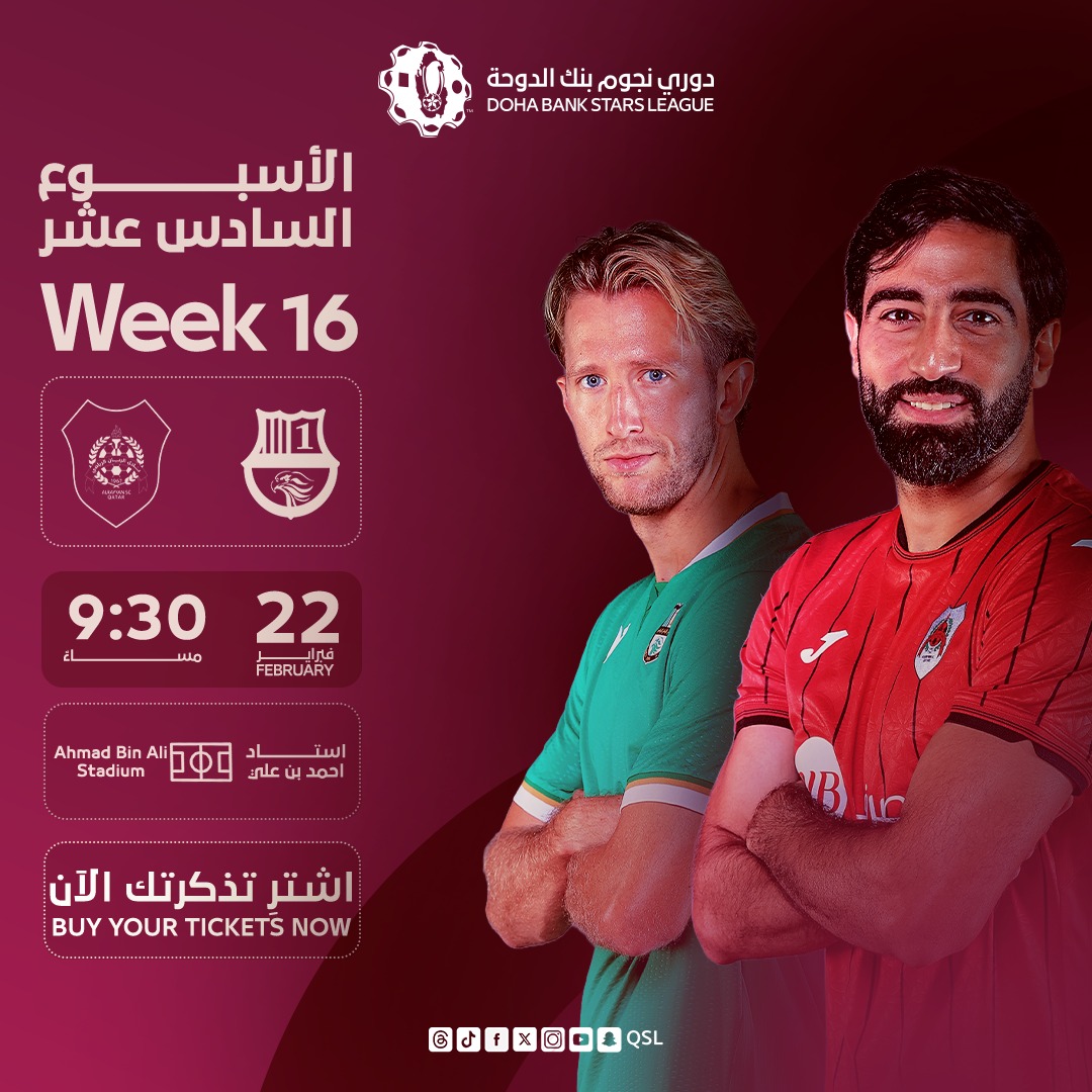 تتواصل مباريات الأسبوع السادس عشر من بطولة دوري نجوم بنك الدوحة للموسم الكروي 2025-2026، بلقاء قوي يجمع الريان مع الأهلي في التاسعة والنصف من مساء الأحد 22 فبراير 2026 على استاد أحمد بن علي.