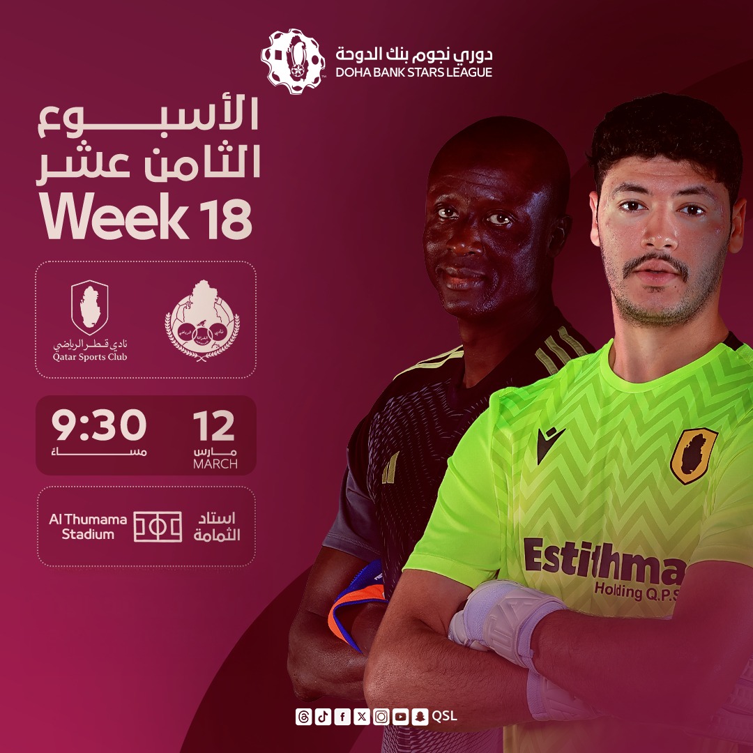 يستضيف استاد الثمامة، مواجهة مرتقبة تجمع بين نادي قطر والغرافة مساء الخميس 12 مارس 2026، الساعة التاسعة والنصف، ضمن منافسات الأسبوع الثامن عشر من دوري نجوم بنك الدوحة.