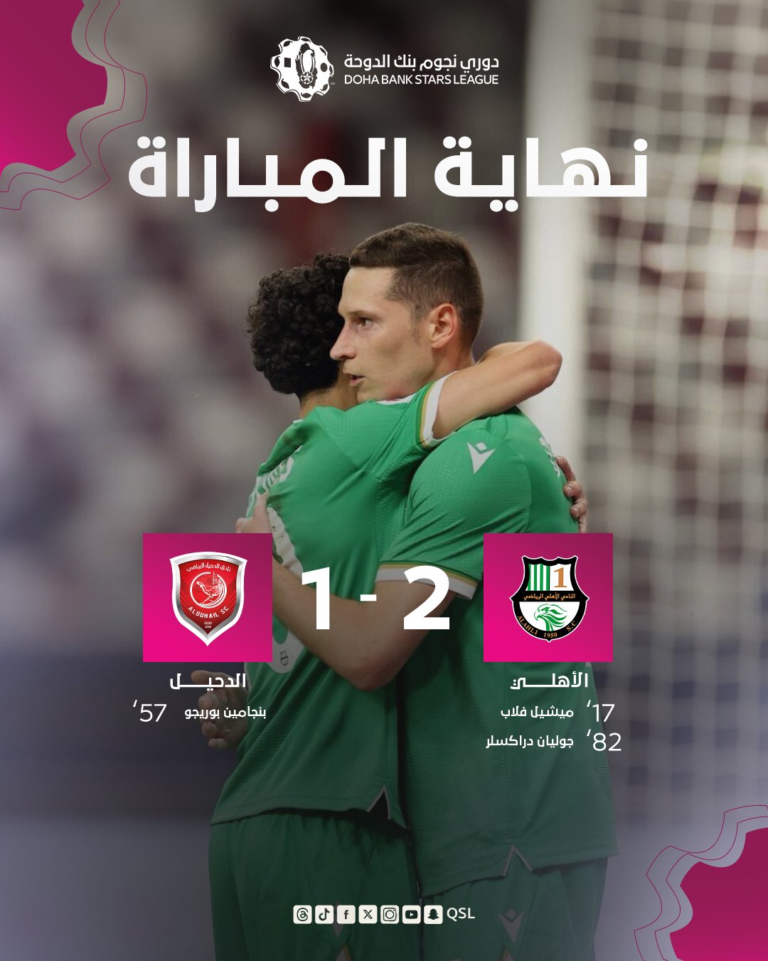 وبهذة النتيجة رفع الأهلي رصيده الى 23 نقطة، فيما بقي الدحيل برصيد 30 نقطة.