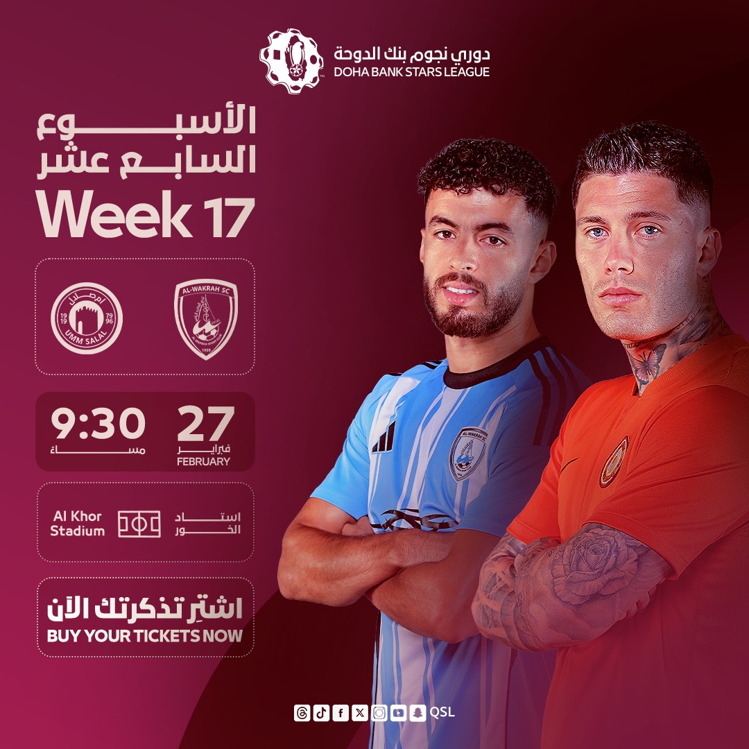 Umm Salal will face Al Wakrah in Week 17 of 2025-2026 season Doha Bank Stars League at the Al Khor Stadium on Friday, February 27, 2026. The kick-off is at 9.30pm.