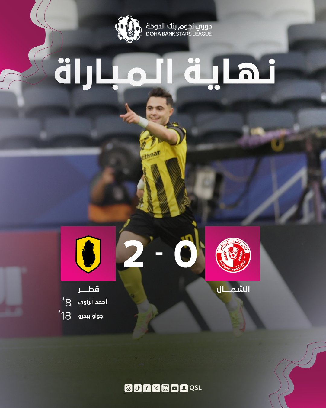 حقق نادي قطر الفوز بهدفين دون رد، على الشمال في المباراة التي جمعت الفريقين على استاد البيت، لحساب مباريات الجولة السابعة عشرة المؤجلة من منافسات دوري نجوم بنك الدوحة للموسم 2025-2026.