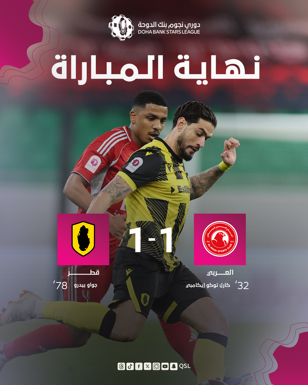 وفي الشوط الثاني، نجح نادي قطر في العودة بالنتيجة، بعدما سجل البرازيلي جواو بيدرو هدف التعادل في الدقيقة 78 ليمنح فريقه نقطة ثمينة في توقيت مهم من عمر المباراة.