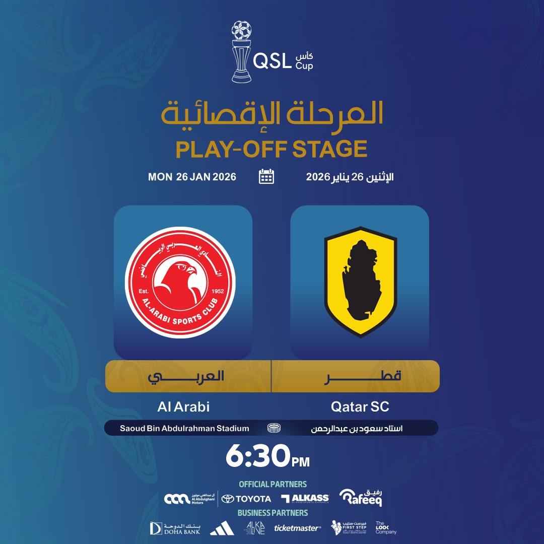 يلتقي فريقا العربي وقطر مساء الإثنين الموافق 26 يناير 2026، على استاد سعود بن عبد الرحمن بنادي الوكرة، في مواجهة مرتقبة ضمن المرحلة الإقصائية لبطولة كأس QSL، وذلك عند الساعة السادسة والنصف مساءً.