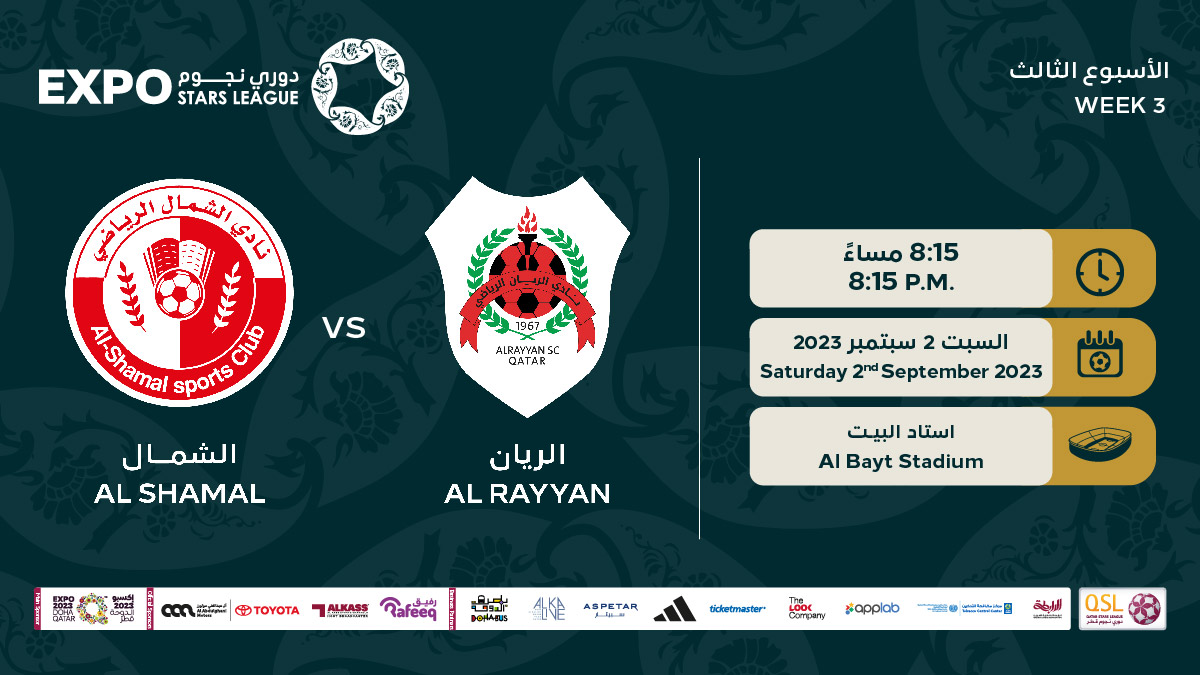 يصطدم الشمال بمنافسه الريان على استاد البيت، في مباريات الأسبوع الثالث من دوري نجوم إكسبو للموسم 2023- 2024، عند الساعة الثامنة و15 مساء السبت 2 سبتمبر 2023 .