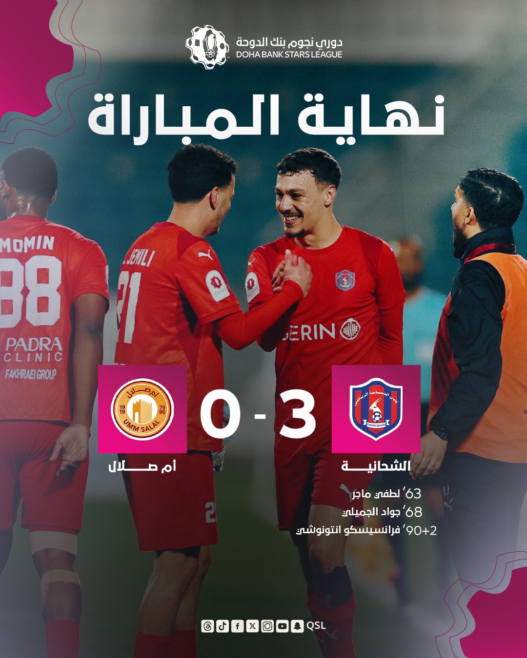 حقق الشحانية فوزًا ثمينًا على حساب أم صلال بثلاثية دون رد، في المباراة التي جمعت الفريقين مساء الجمعة 16 يناير 2026، على ملعب الخور ضمن منافسات الجولة الثالثة عشرة من دوري نجوم بنك الدوحة.