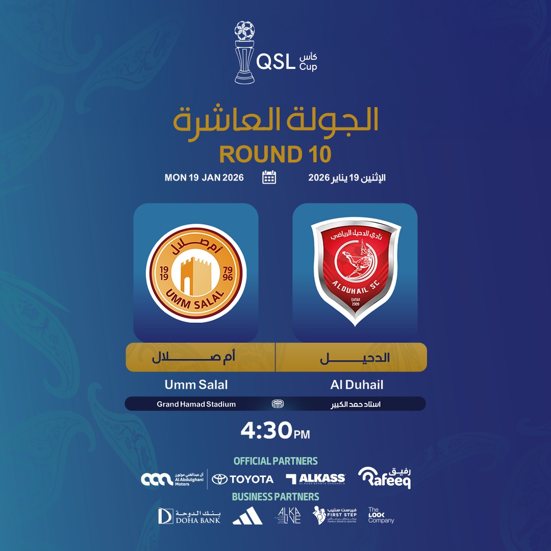 يلتقي فريقا أم صلال والدحيل، يوم الإثنين الموافق 19 يناير 2026، عند الساعة الرابعة والنصف مساءً ضمن منافسات الجولة العاشرة من بطولة كأس QSL، في اللقاء الذي يحتضنه استاد حمد الكبير.