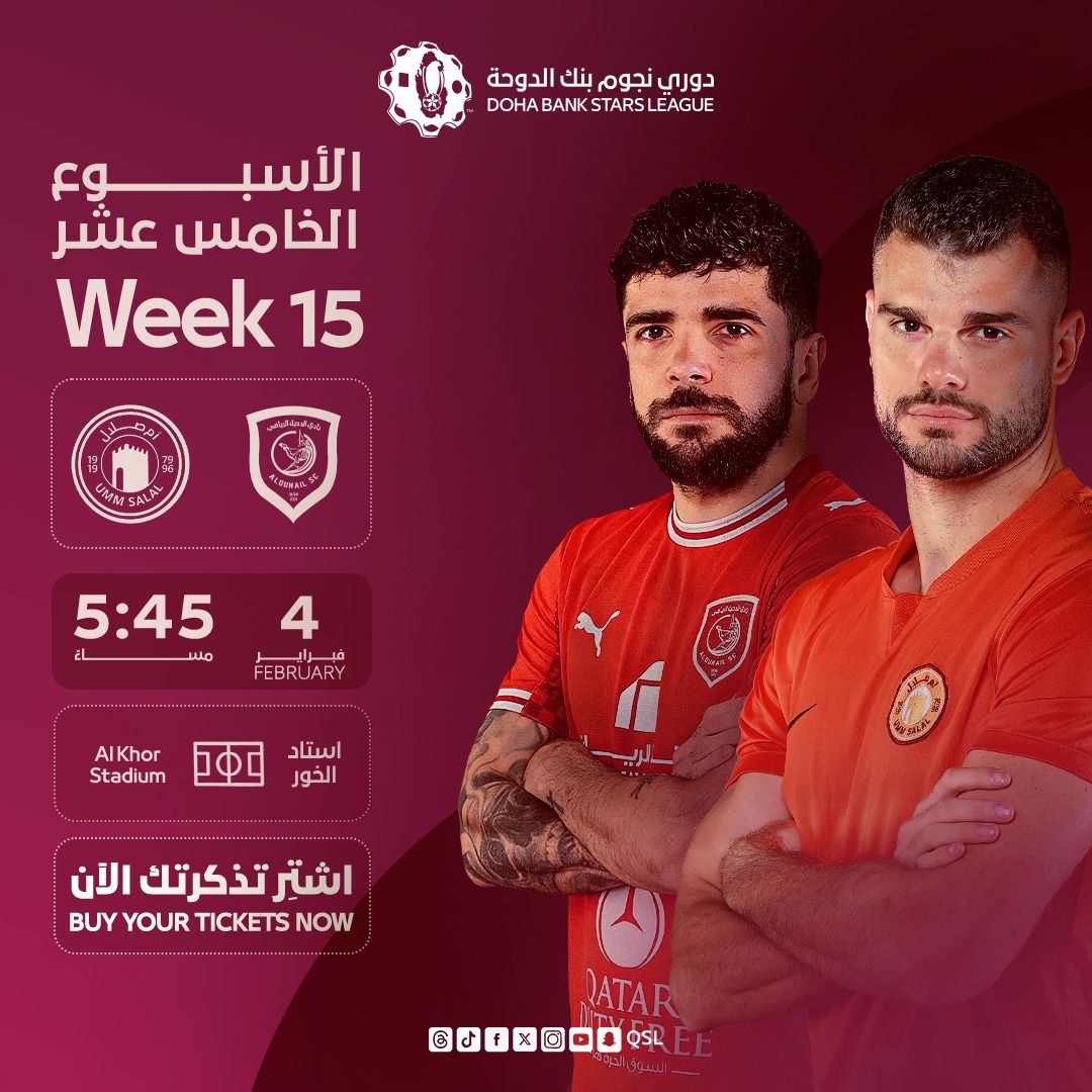 يفتتح فريقا أم صلال والدحيل مباريات الأسبوع الخامس عشر لدوري نجوم بنك الدوحة، يوم الأربعاء الموافق 4 فبراير 2026، الساعة 5:45 مساءً، على استاد الخور، في لقاء يرفع فيه الفريقان شعار «لا بديل عن الفوز» نظرًا لأهميته الكبيرة في حسابات الترتيب.