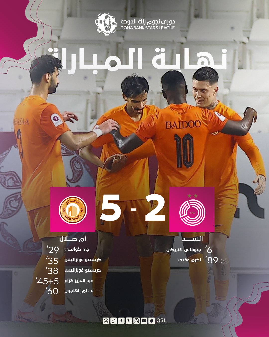 وبهذة النتيجة رفع أم صلال رصيده للنقطة 19، وبقي السد برصيد 38 نقطة.