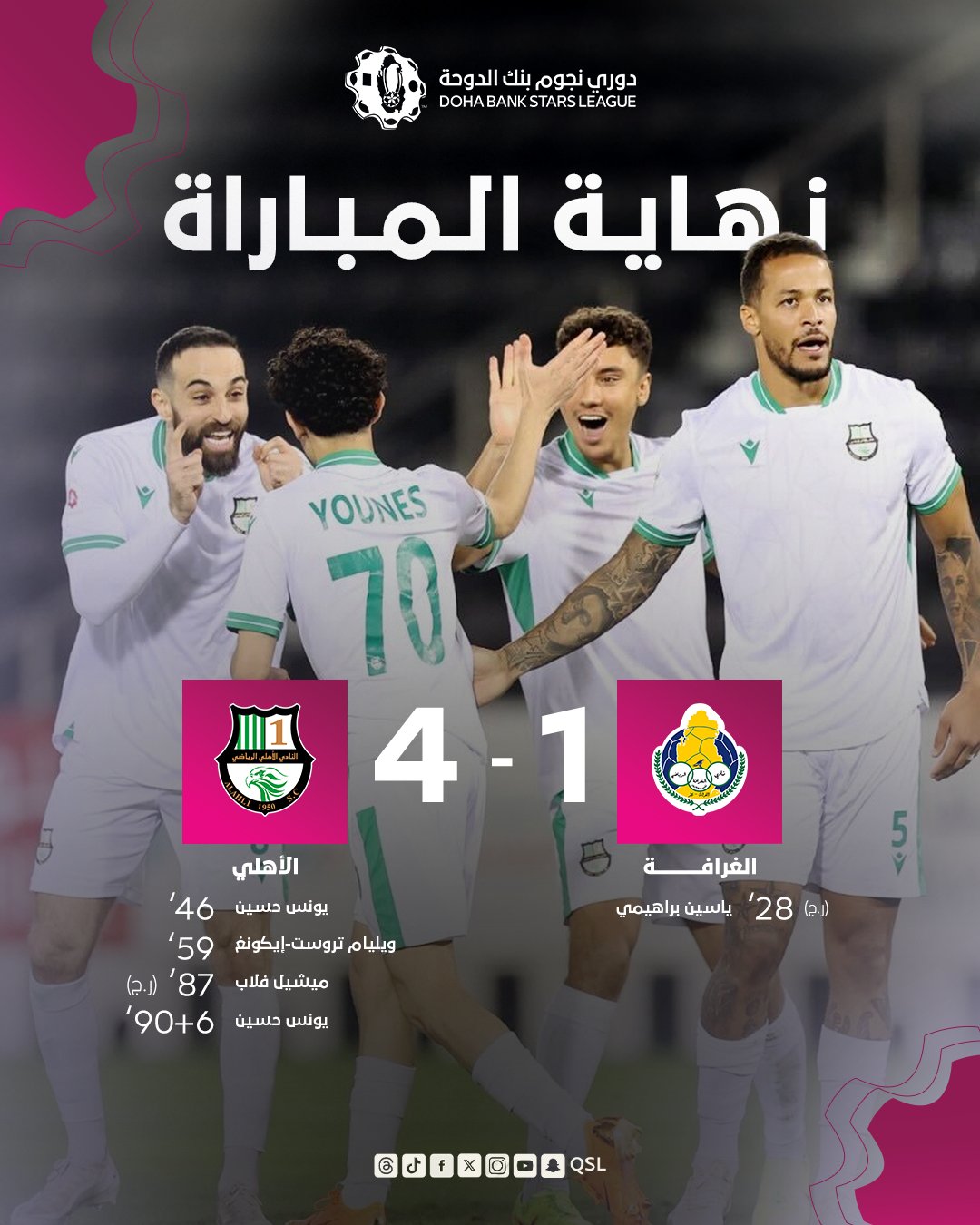 تغلب الأهلي بأربعة أهداف مقابل هدف على الغرافة، ضمن منافسات الأسبوع التاسع عشر من دوري نجوم بنك الدوحة للموسم الكروي 2025-2026 ، والتي جمعت الفريقين على استاد جاسم بن حمد يوم الأربعاء الموافق 18 مارس 2026.