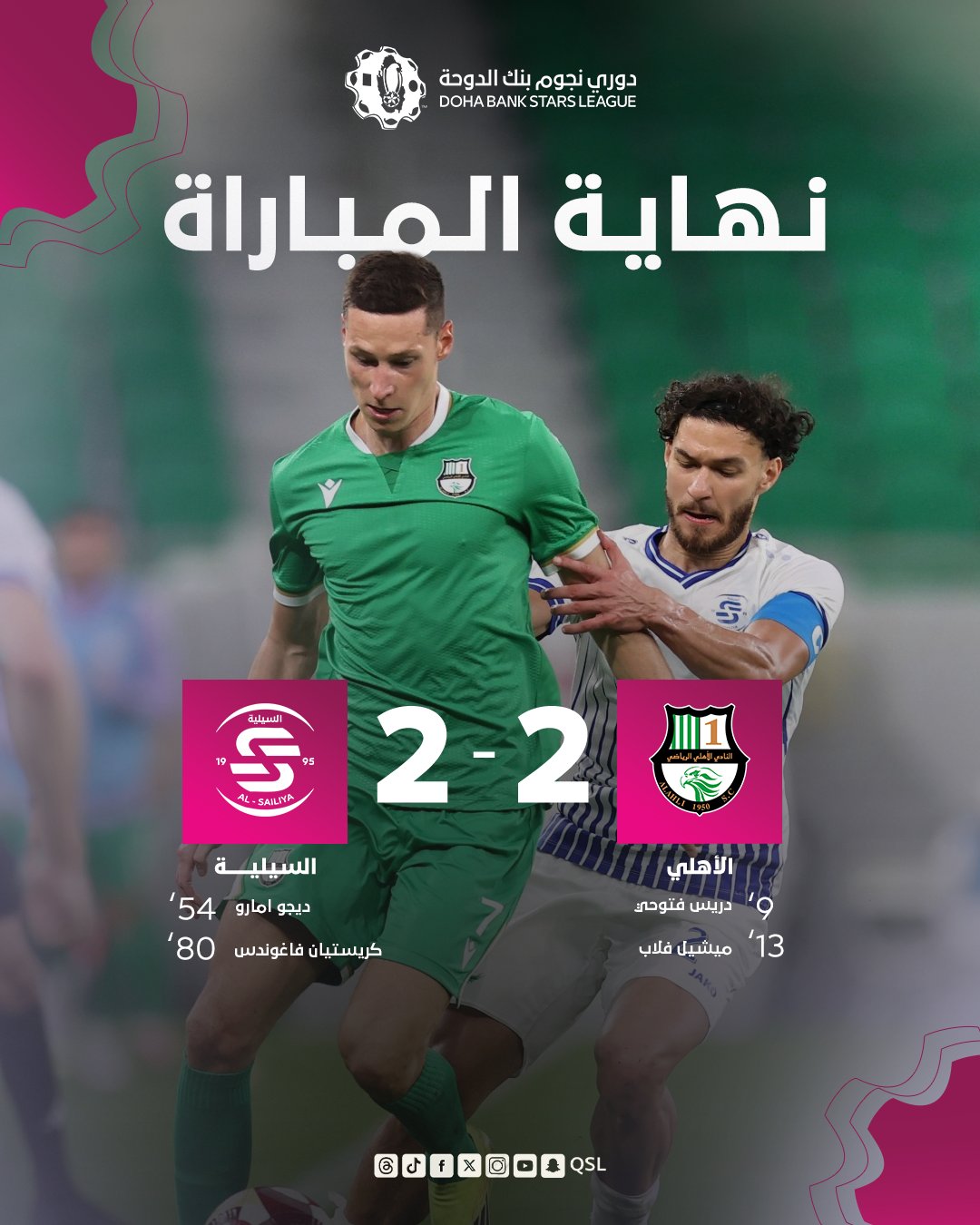 خطف السيلية تعادلًا ثمينًا أمام الأهلي بنتيجة (2-2)، في المباراة التي أقيمت مساء اليوم على استاد الثمامة، ضمن منافسات الجولة العشرين من دوري نجوم بنك الدوحة، للموسم الكروي 2025-2026 , بعد عودة قوية من تأخره بهدفين دون رد.
