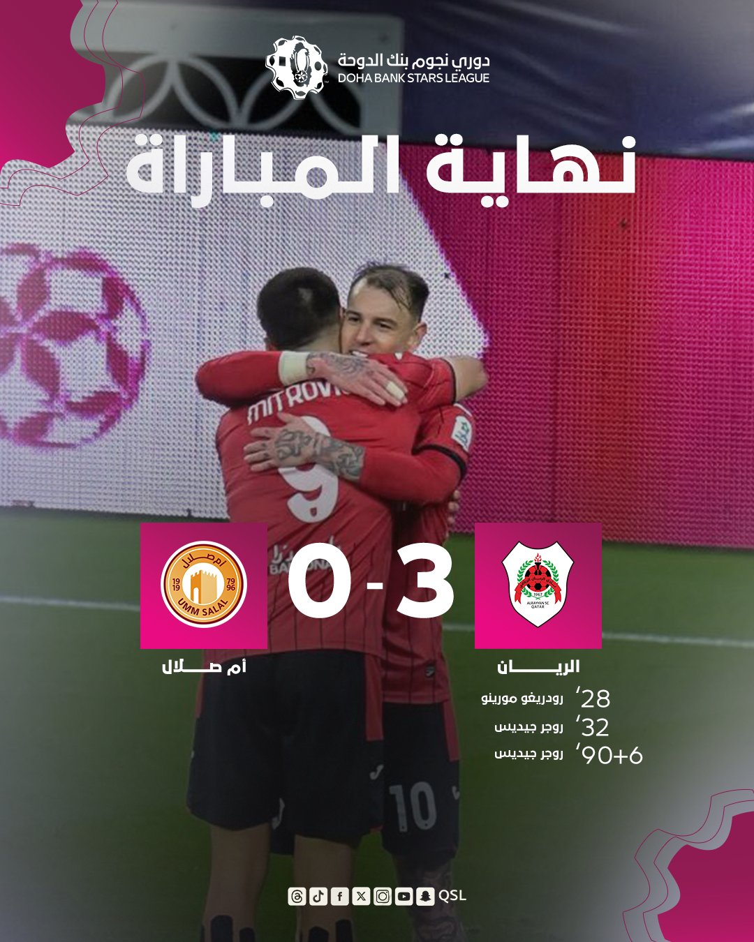 وبهذا الانتصار، رفع الريان رصيده إلى 35 نقطة ليعزز موقعه في المربع، في المقابل، تجمد رصيد أم صلال عند 20 نقطة.