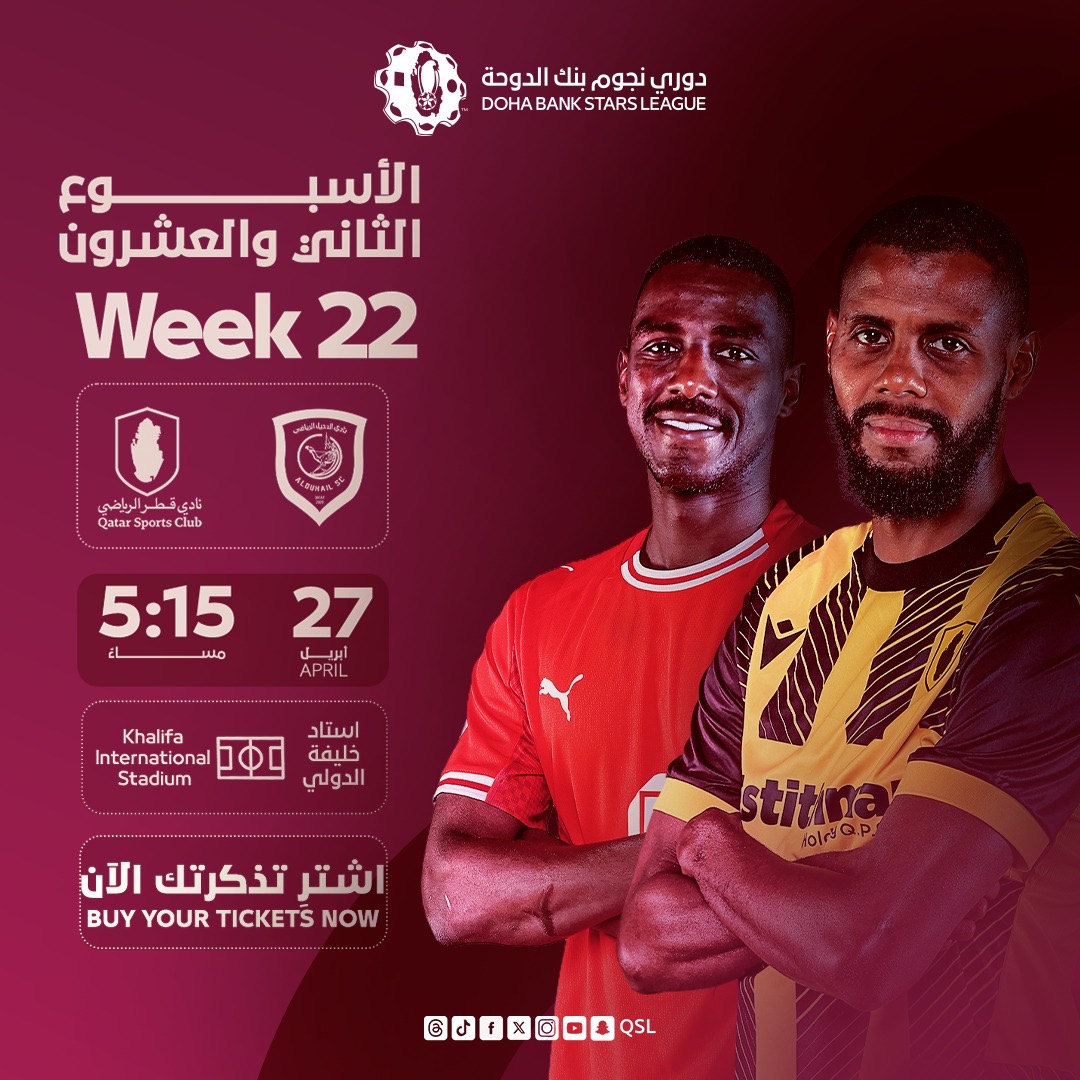 يستضيف استاد خليفة الدولي، الساعة الخامسة والربع مساء يوم الإثنين 27 أبريل 2026، مواجهة تجمع بين نادي قطر والدحيل، ضمن الأسبوع الثاني والعشرين والأخيرة من دوري نجوم بنك الدوحة 2025- 2026.